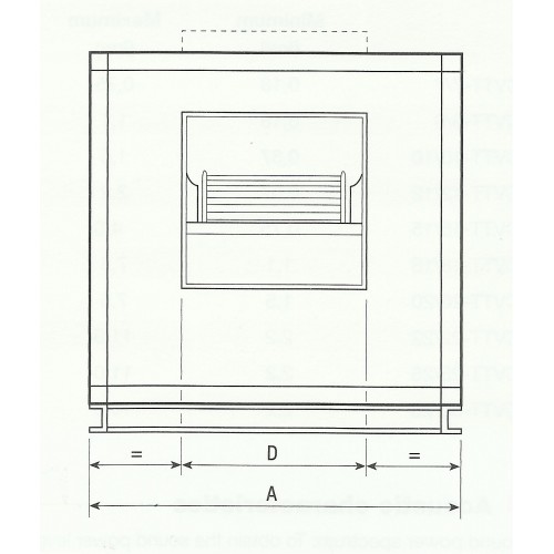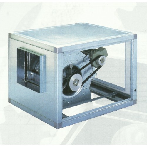 Centrifugal fan made of zinc-plated steel and flame-retardant acoustic lining, front curved centrifugal rotor with anti-vibration mounts and flexible flange for unloading.